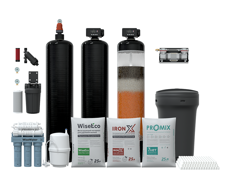 Система включает в себя аэрационную колонну, безмасляный малошумный компрессор AS, автоматический безреагентный фильтр-обезжелезиватель, универсальный фильтр с баком для соли, колбу BB 10” с угольным картриджем, манометры, дисковый фильтр и фильтрующие загрузки. WiseWater Osmos BioEnergy добавляет 7 ступеней очистки для исключительного качества воды.